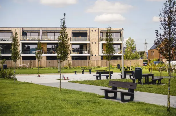 The 7.5 ha site comprises a wide variety of housing types and villa apartments that accommodate both large, small and blended families. The apartments have a residential character and are laid out around a central square. Matexi took great pains to integrate the neighbourhood into the surrounding area. Every dwelling affords a view of the surrounding greenery. The result is a balanced streetscape, with low-traffic streets and green squares. Dedicated connections and paths enable cyclists and pedestrians to traverse the neighbourhood easily and safely. A meandering walking path that encircles the site, blooming hedges, a green zone and an adventurous play forest are typical features of this atmospheric neighbourhood.