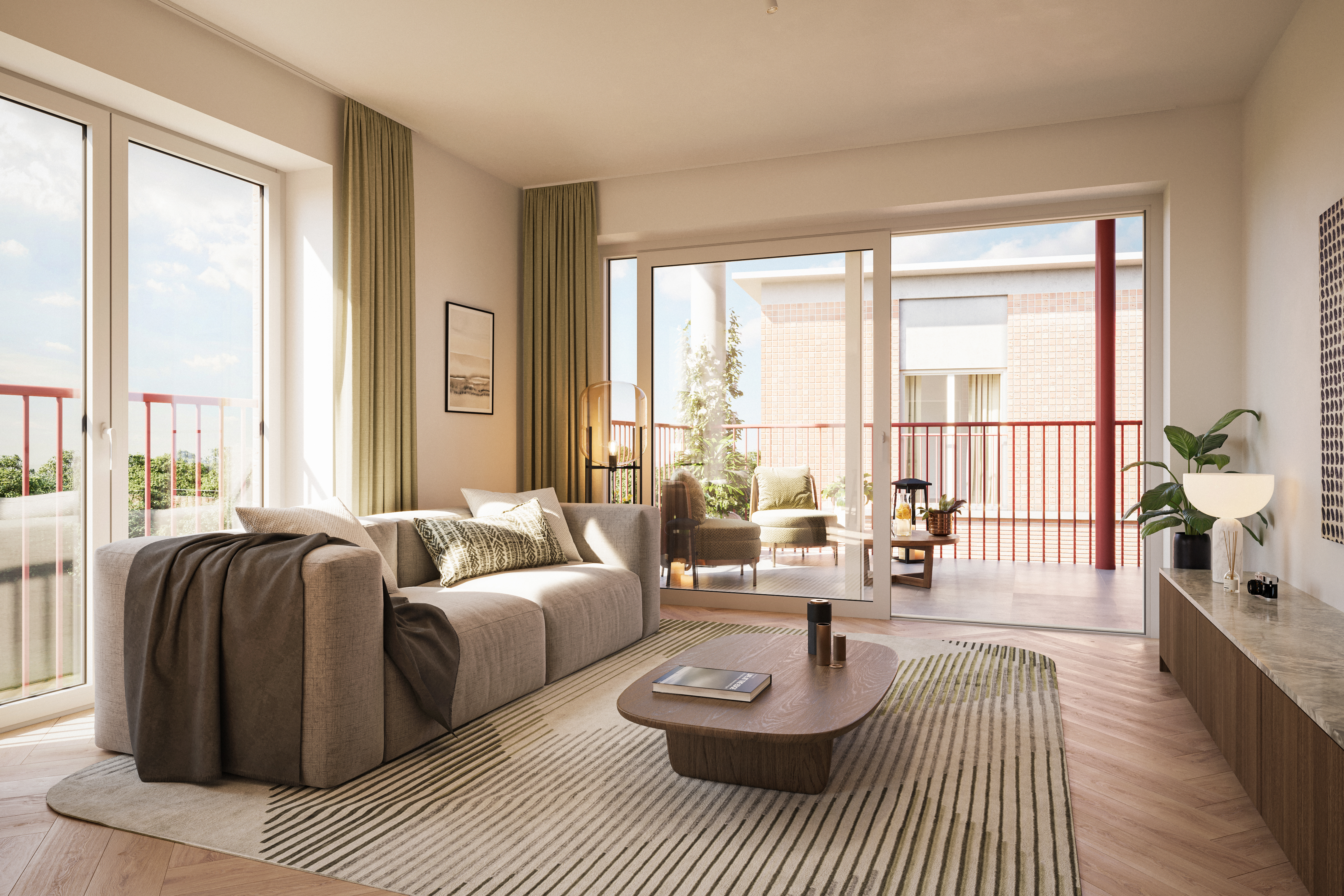 Each home has an underground parking space, prepared for an electric charging station. The buildings are designed in a modern style with pink brick and white joinery, giving them a warm and inviting look.