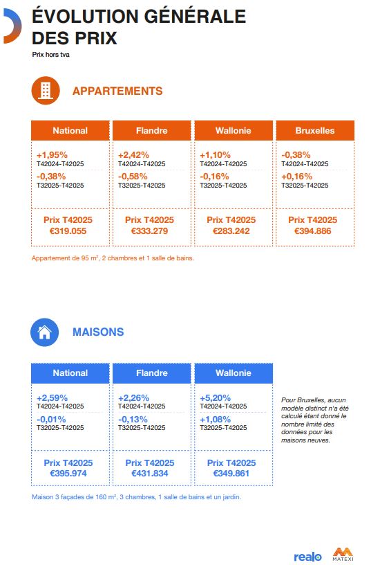 Sur une base annuelle, les prix des appartements neufs progressent en Flandre (+2,42 %) et en Wallonie (+1,10 %), tandis qu’ils reculent légèrement à Bruxelles (-0,38 %).
