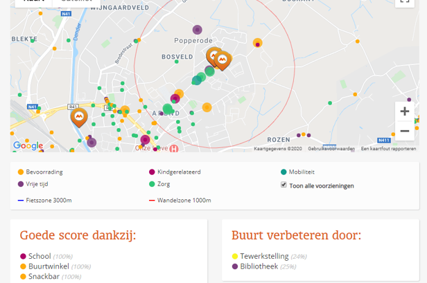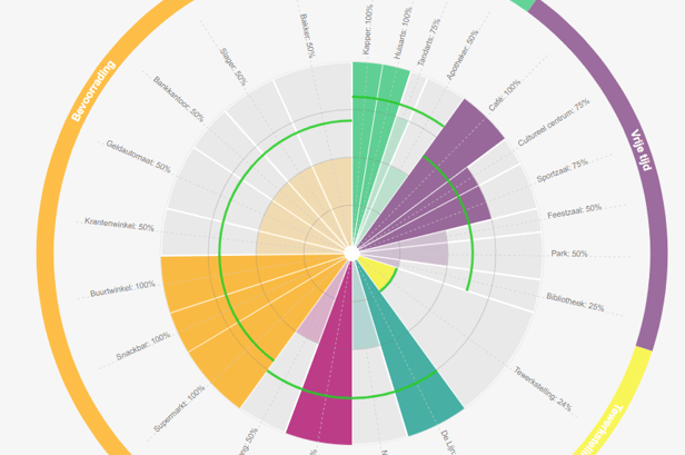 Le Baromètre examine chaque quartier sous de nombreux angles. Outre un score général, il attribue une note à chaque infrastructure et à chaque aspect. On pense évidemment à la mobilité, mais aussi à des éléments comme les établissements de soins (y a-t-il un médecin ou un hôpital à proximité ?), les installations adaptées aux enfants (crèches, plaine de jeux), l'emploi, les loisirs, les commerces, etc. L'attention portée à ces divers aspects fait du Baromètre de quartier un instrument de mesure très personnel : en tant que ville ou commune, vous pouvez adapter le poids de chaque élément en fonction des besoins. Ce faisant, nous pourrons arriver ensemble à une politique plus axée sur les quartiers.
