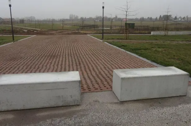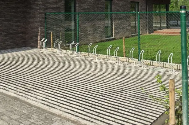 Emplacements pour vélos en pavés perméables à joints en terre battue (Halle – Nederheim)