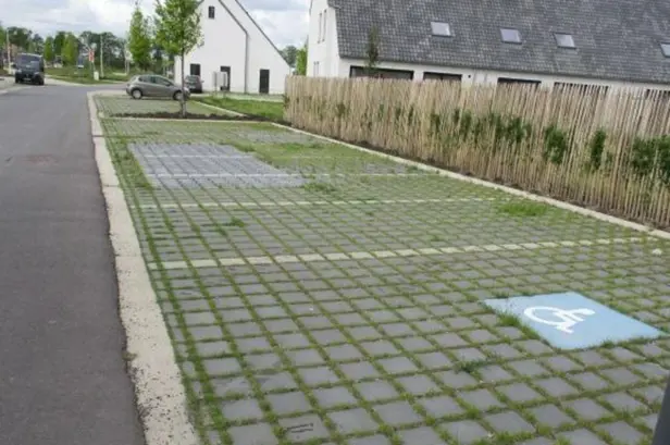 Emplacements de parking en pavés en béton perméables ensemencés (Jabbeke – Hof van Straeten)