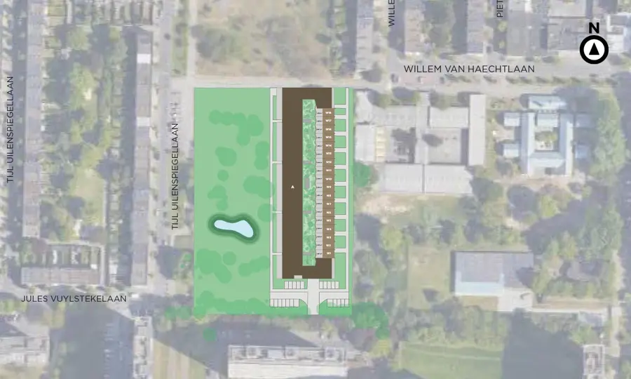 Les maisons et appartements de Tijl Uilenspiegel s’organisent autour d’une zone verte sans circulation automobile. Grâce aux parkings intégrés, l’espace est libéré pour de grandes terrasses, des jardins et des lieux de rencontre. Le parc s’étend littéralement jusqu’à votre porte — un endroit où les voisins se connaissent et où les enfants jouent en toute sécurité.