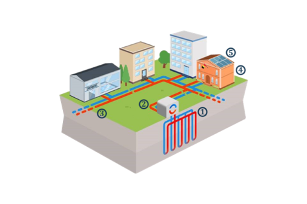 L’eau sortant des puits verticaux est réchauffée à 35°C via les pompes à chaleur.