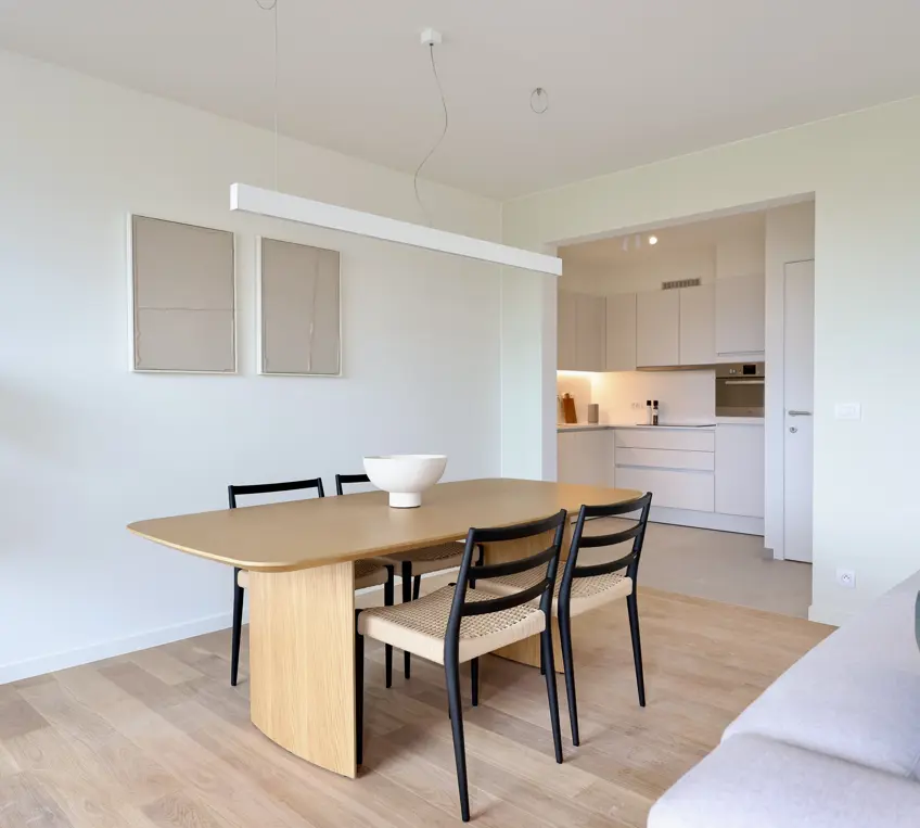 L'appartement témoin dispose d'une pièce de vie lumineuse avec cuisine ouverte. Les finitions sur mesure sont impeccables.