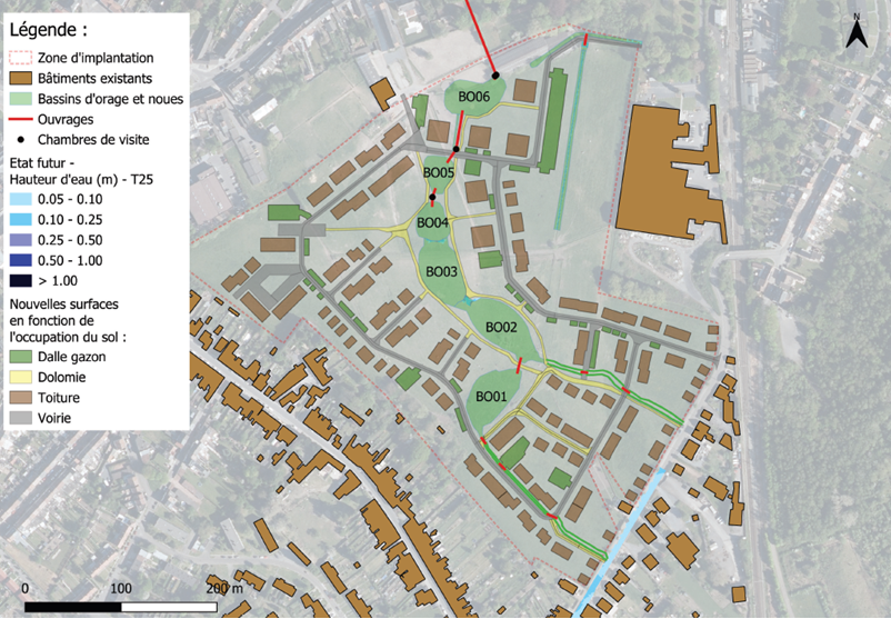 Sur base de l’état existant, une modélisation de la situation future a été réalisée en intégrant les modifications de topographie, les nouvelles implantations et les surfaces imperméabilisées.