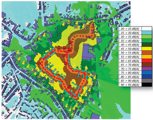 Localement, une augmentation comprise entre 4 et 7 dB(A) peut être observée. Celle-ci reste toutefois limitée à l’espace extérieur et ne devrait pas entraîner d’élévation perceptible du niveau sonore à l’intérieur des habitations.
