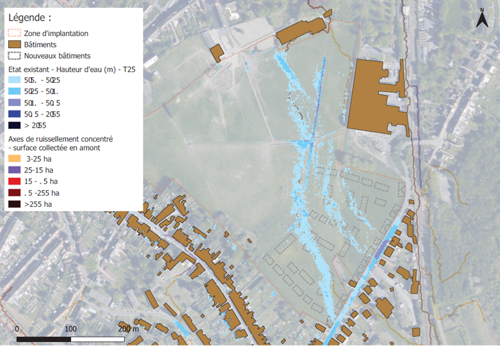 La modélisation a permis d’identifier les axes naturels de ruissellement existants sur le terrain. Les résultats confirment que, dans la situation actuelle, le risque de ruissellement n’est pas nul et qu’une accumulation d’eau est déjà observée rue Hector Delanois et sur le site.