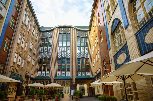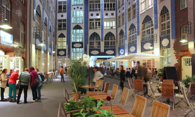 Als je vandaag door de Hackesche Höfe flaneert en er met volle teugen geniet van het bruisende stadsleven, doet niets vermoeden dat deze inspirerende en fascinerende plek een woelige geschiedenis achter de rug heeft. De buurt is genoemd naar Hans Christoph Friedrich von Hacke (stadscommandant in het midden van de achttiende eeuw), net als de aanpalende Hackescher Markt. Ze maakt deel uit van de Spandauer Vorstadt in het district Mitte. De eerste aanzet voor de realisatie van de Hackesche Höfe kwam van glasfabrikant Hans Quilitz en zijn nazaten, die vanaf 1858 de omringende percelen aanschaften. Dit vergemakkelijkte het ontwikkelingsproces, dat in 1906 uitmondde in de bouw van een iconisch binnenhovencomplex – het grootste in zijn soort in Berlijn, destijds de dichtstbevolkte stad ter wereld.