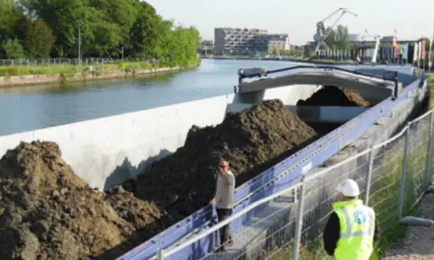 Quartier Bleu Hasselt De nieuwe binnenstedelijke ontwikkeling aan de Hasseltse Kanaalkom maakte gretig gebruik van de ligging naast het Albertkanaal om op een duurzame manier de grond van de enorme bouwput af te voeren. Maar liefst 3 vrachtschepen per dag voerden in totaal 400.000 m³ grond af. Dat is een equivalent van 40.000 vrachtwagentransporten! Of 40.000 vrachtwagens minder over de singel... .