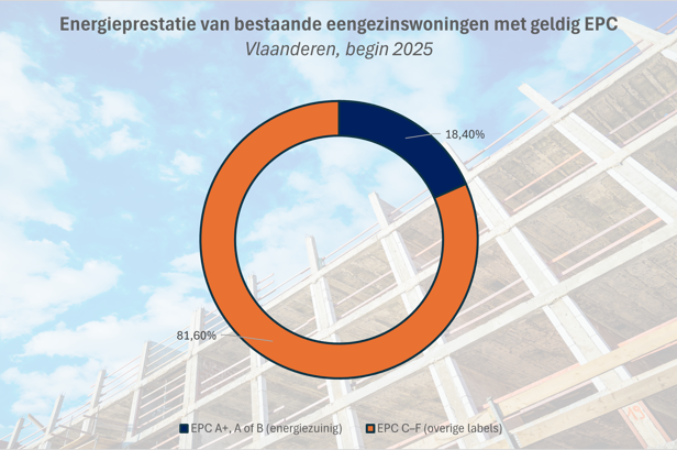 Deze grafiek schetst de uitgangssituatie waarbinnen energiezuinig renoveren vandaag wordt benaderd. Slechts 18,4% van de eengezinswoningen met een geldig EPC behaalt een energiezuinig label (A+, A of B). Nieuwbouwwoningen en recent gerenoveerde woningen zonder recente verkoop- of verhuurtransactie zijn in deze statistiek ondervertegenwoordigd.
