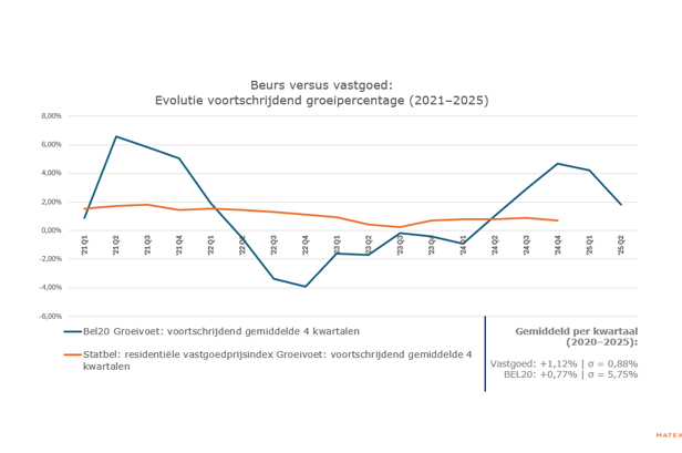 “Vastgoed blijft aantrekkelijk voor wie op zoek is naar stabiliteit” (De Morgen, april 2025). Die perceptie leeft niet toevallig – ze wordt onderbouwd door structurele cijfers en duidelijke verschillen in dynamiek tussen beide activaklassen.
