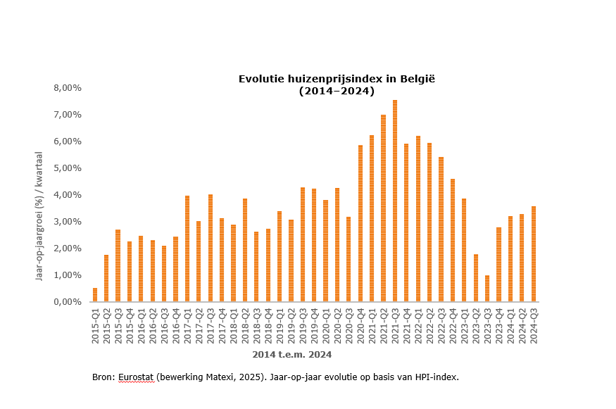 Volgens Eurostat kende de Belgische huizenprijsindex sinds 2014 geen enkele jaar-op-jaar daling meer. Zelfs in crisismomenten – zoals de coronapandemie of energiecrisis – bleef de prijsevolutie positief.