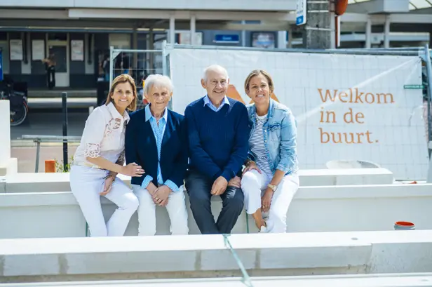 Ondertussen mochten Jan en Agnes mee de eerste steen van het woonproject leggen. Er komt een L-vormig gebouw met 38 appartementen, in afwisselend drie, twee en vier verdiepingen. Daarnaast ook vier handels- of kantoorruimtes, een ondergrondse private parking, een binnentuin en een daktuin van 300 m2 voor de bewoners van de appartementen. Bovengronds komen er 24 publieke parkeerplaatsen en 118 fietsenstalplaatsen, vlakbij het station dus.