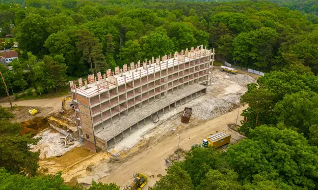 “We creëren hier op een duurzame manier extra woonaanbod, zonder de open ruimte rondom het project aan te snijden”, vertelt Gert Petit, senior Project Developer bij Matexi. “We behouden een deel van het bestaande skelet van Herfstvreugde en voegen twee nieuwe extensies toe aan weerszijden van het gebouw. De gekromde hoofdvleugel en twee dwarsvleugels zorgen voor een elegant ontwerp, waarbij de 70 appartementen genieten van optimale bezonning en maximale openheid in de natuurlijke omgeving.” De west- en middenvleugel zullen 7 bouwlagen omvatten, de oostvleugel heeft 9 bouwlagen.
