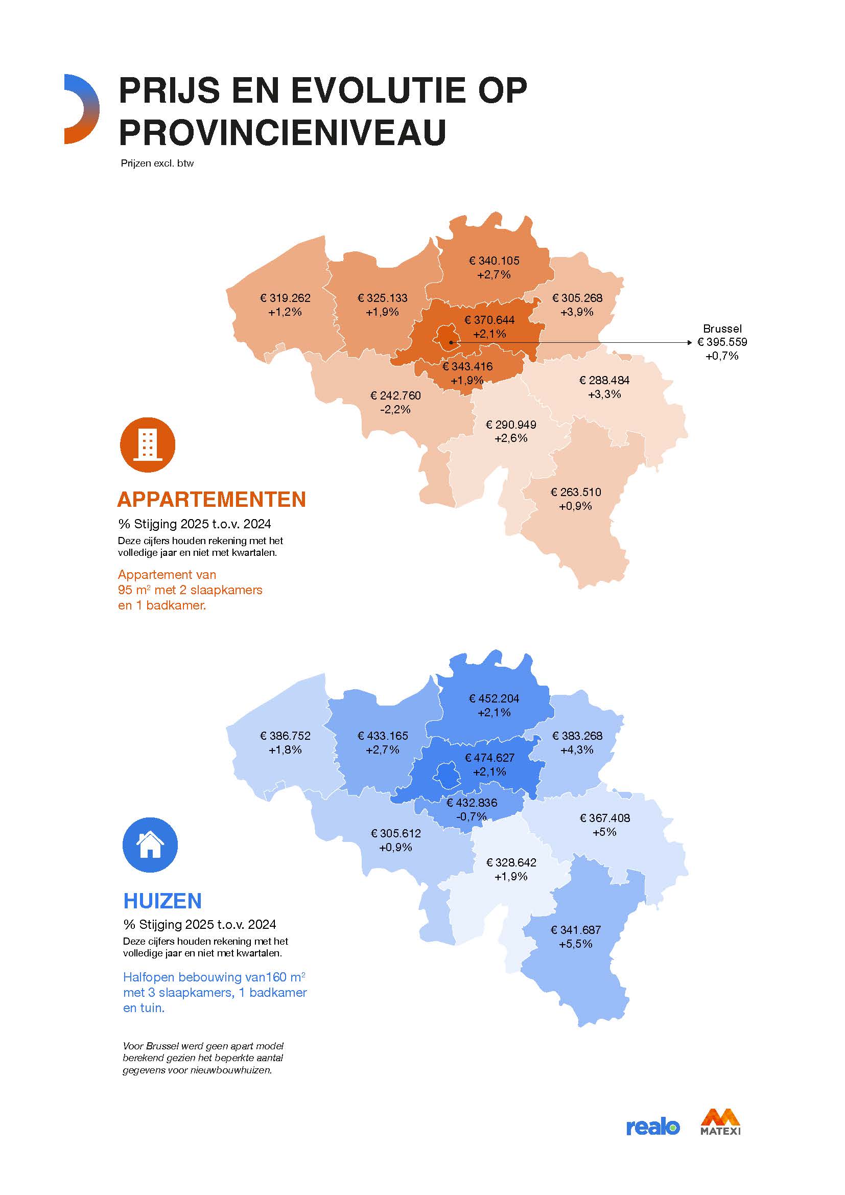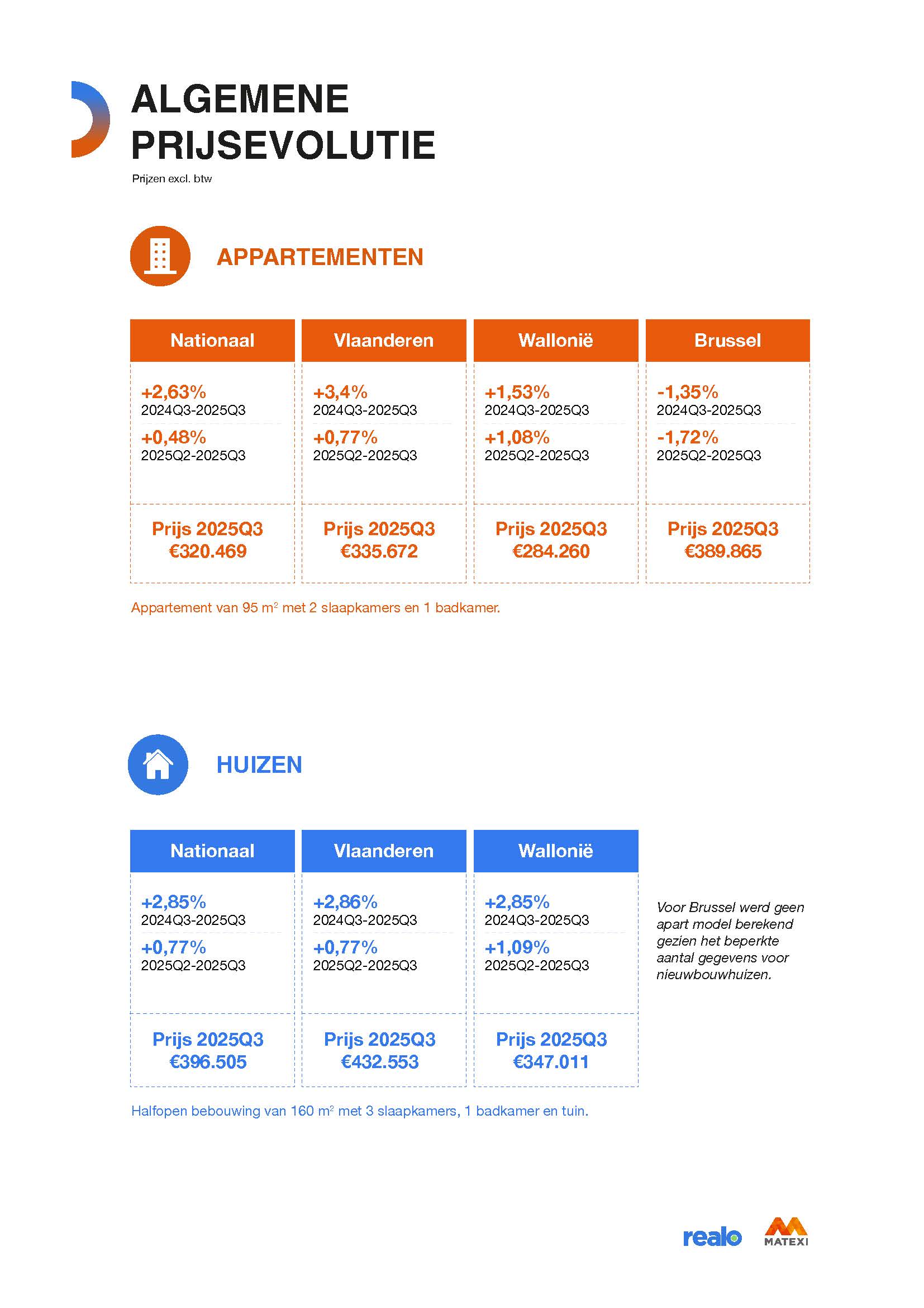 De Nieuwbouwbarometer volgt de prijsevoluties (excl. btw) voor een gemiddelde Belgische woning, zijnde een halfopen bebouwing van 160m2 met drie slaapkamers, badkamer en tuin. In het segment van appartementen gaat dit om een appartement van 95m2 met twee slaapkamers en badkamer.