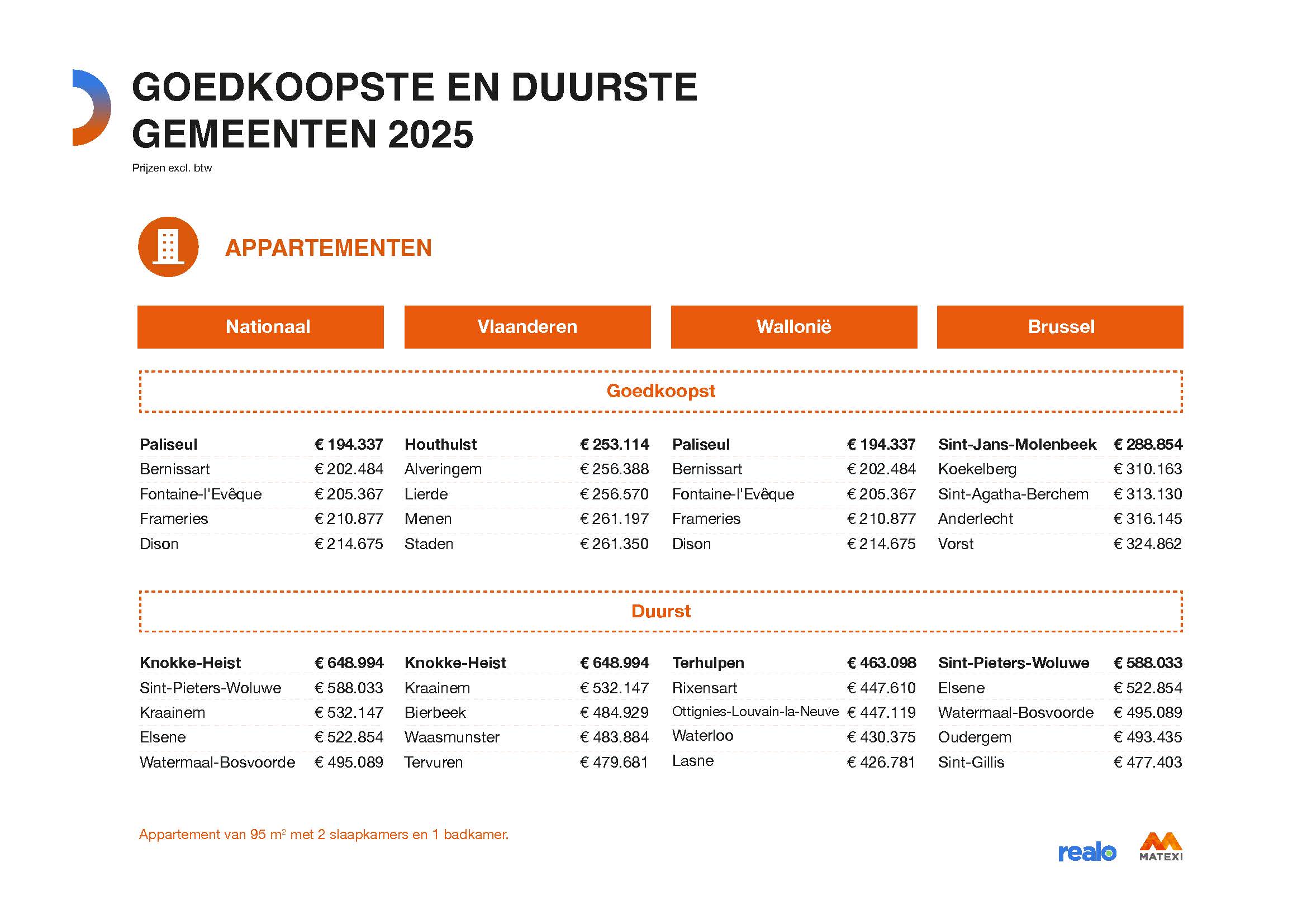 De prijzen van nieuwbouwappartementen en -huizen in België zijn de afgelopen twaalf maanden gemiddeld gestegen met respectievelijk 2,63% en 2,85%. De prijzen blijven de inflatie volgen. Dit blijkt uit de recentste editie van de Nieuwbouwbarometer, een initiatief van vastgoeddataplatform Realo en buurtontwikkelaar Matexi.