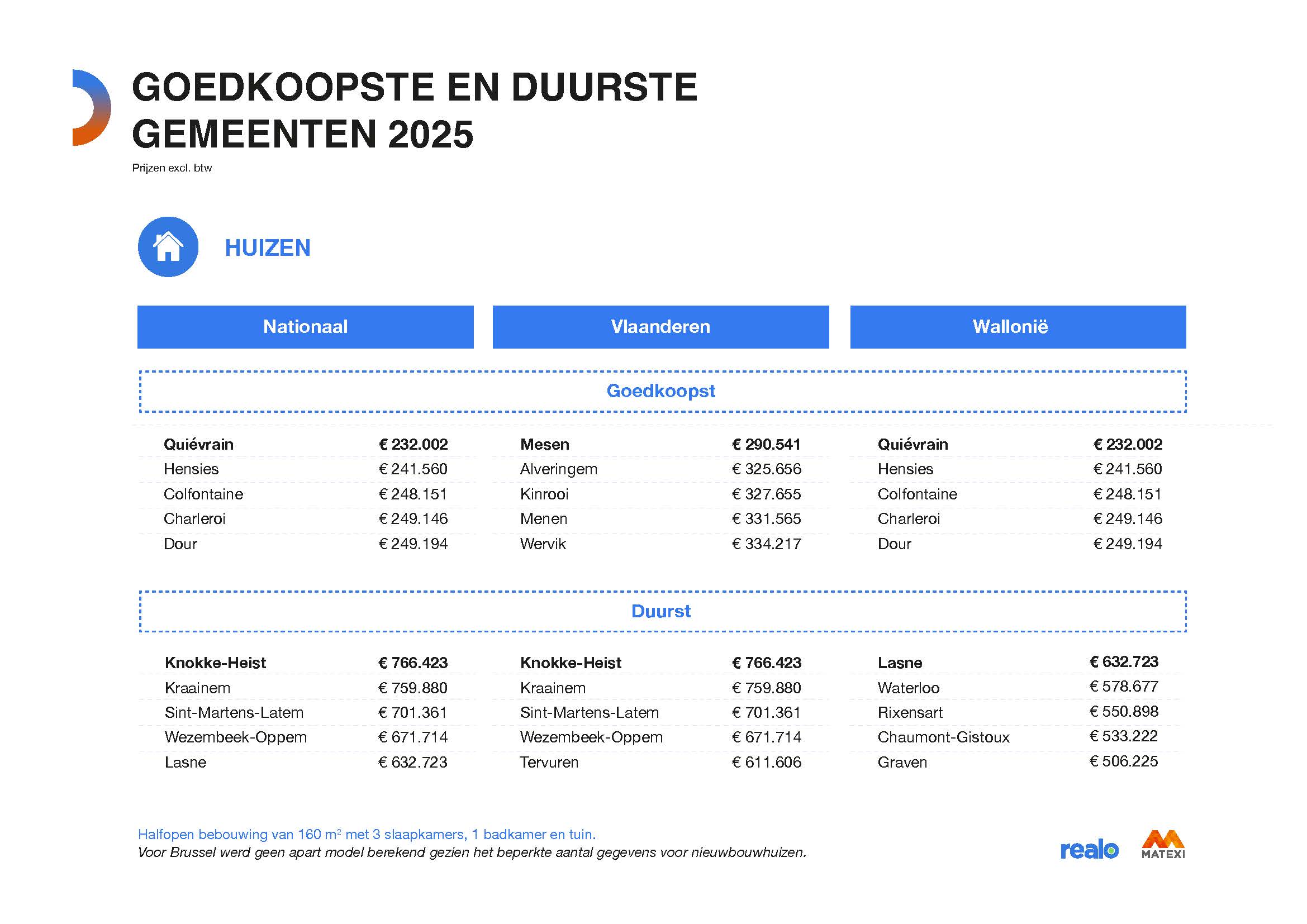 Voor nieuwbouwhuizen stijgen de prijzen gestaag voort, zonder noemenswaardig onderscheid tussen de regio’s. Zo steeg de prijs sinds het derde kwartaal van 2024 zo goed als evenveel in Vlaanderen (+2,68%) als in Wallonië (+2,85%).