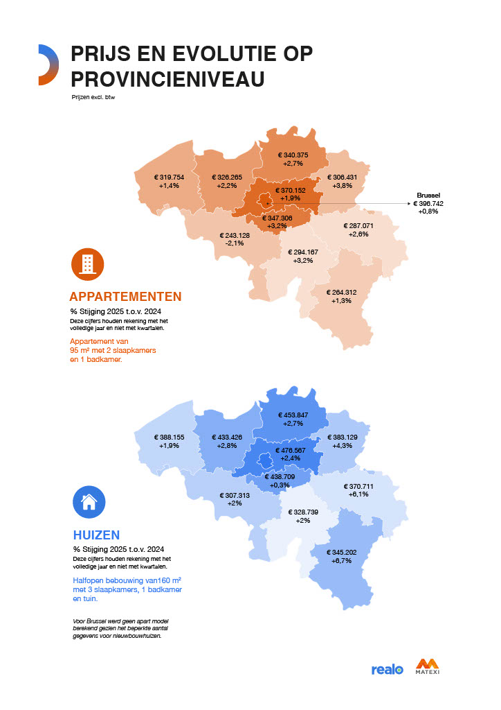 * Op basis van een simulatie voor een referentieappartement of -huis, met een vastrentende hypotheek over 20 jaar waarbij maximaal 33% van het maandinkomen aan woonlasten wordt besteed. In de berekening werd uitgegaan van een eigen inbreng van 20% van de aankoopprijs. De berekening is op basis van de huidige hypotheekrentes en gebruikt de inkomensstatistieken van Statistics Belgium. Tot slot werden ook kosten als registratierechten en btw mee in de berekening genomen.