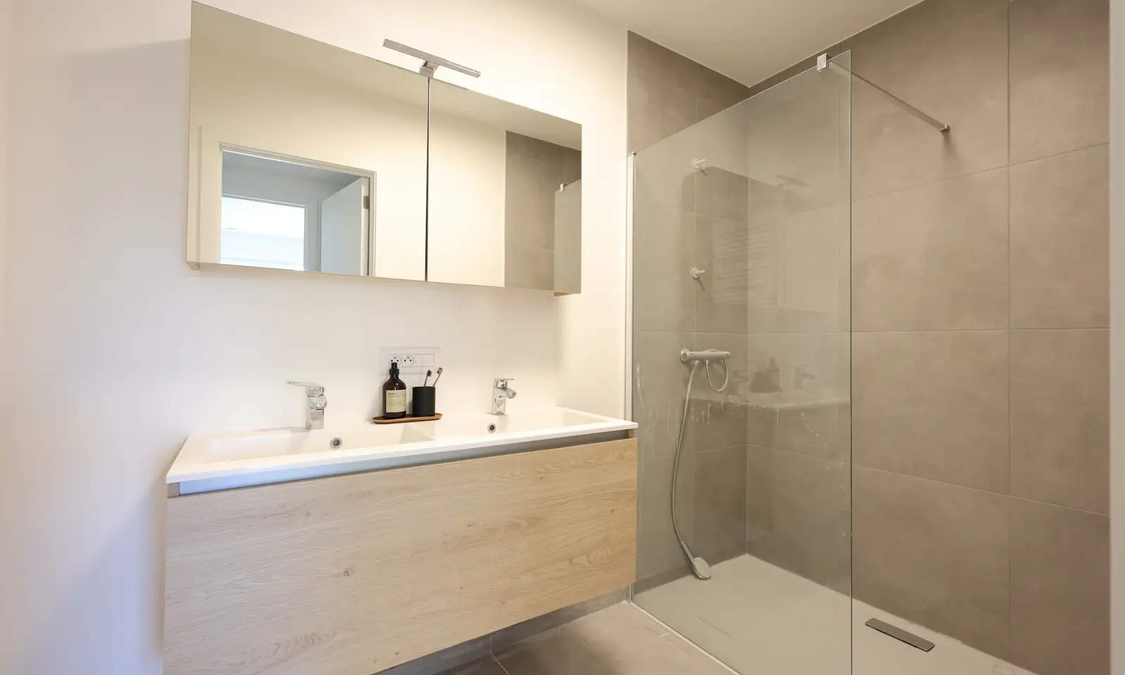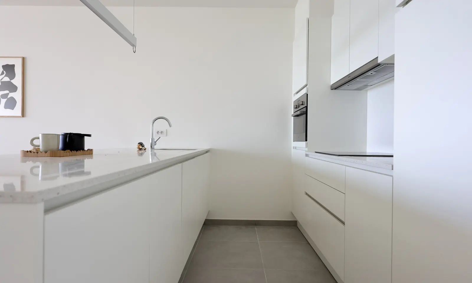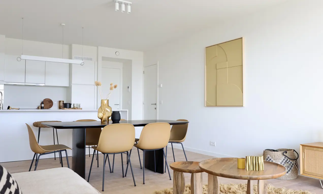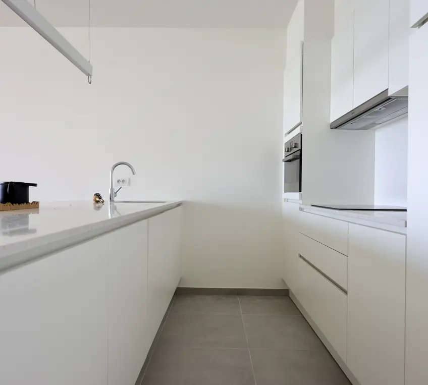 Het kijkappartement beschikt over een lichtrijke leefruimte met open keuken. De afwerking op maat is van onberispelijke kwaliteit.